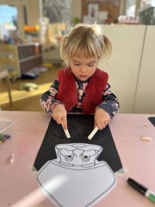 Maar Sint is meer dan kadootjes en verwondering. Sint is ook goed kijken hoe hij eruit ziet, benoemen en nieuwe woorden leren, vaardigheden al spelenderwijs oefenen. De baard van de Sint vol krullen werd met veel concentratie gevormd, met 2 handen tegelijk. Wat een uitdaging voor hoofd en handen. Knap gedaan !