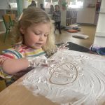 Een lijn wordt een cirkel en nog één en nog één tot de schrijftafel vol is. Met een paar vegen starten we gewoon opnieuw. Op deze manier wordt mee de basis gelegd van het echte schrijven later zonder scheerschuimtafel.